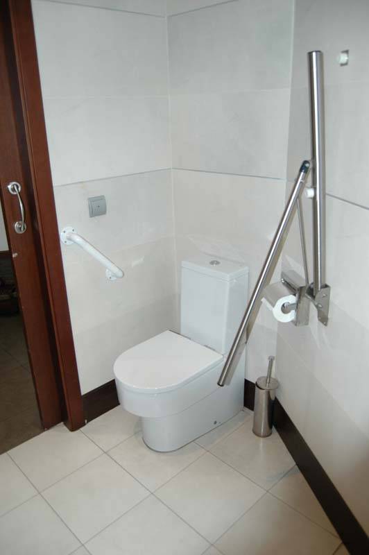 - El inodoro dispone de 2 barras de apoyo, una fija en el lado derecho y otra abatible en el lado izquierdo, situadas a una altura de entre 76 - 96 cm y con una separación entre ellas de 55 cm.